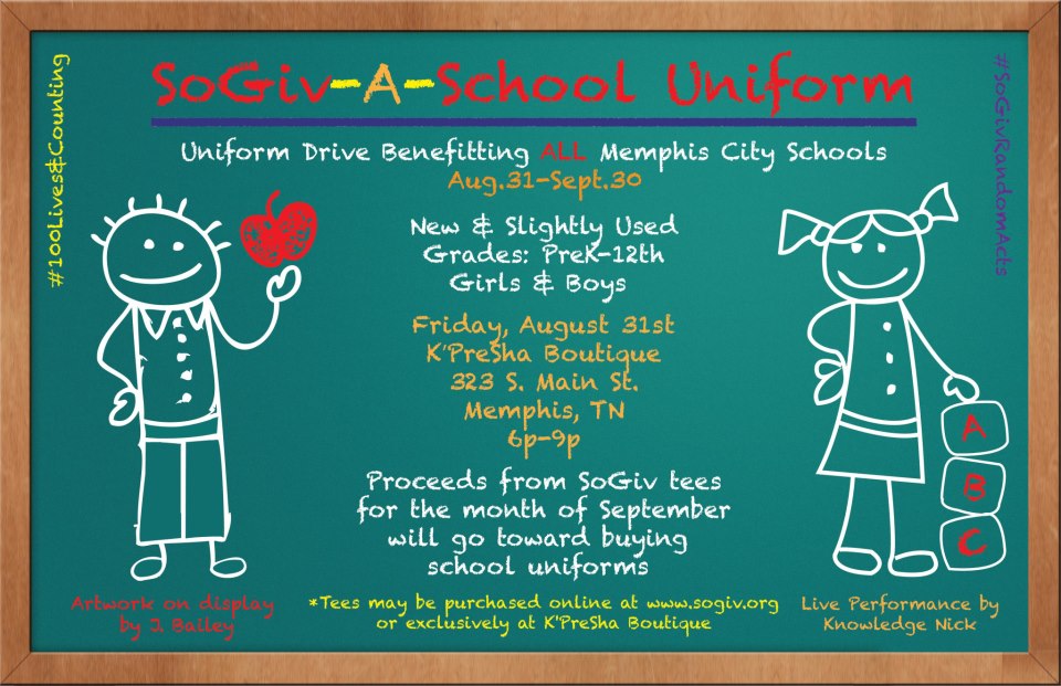 SoGiv, a non-profit apparel company, is hosting a school uniform drive Friday, August 31, 2012 August 31st, from 6p-9p at K’PreSha Boutique (323 S. Main St. Memphis, TN) during South Main’s Trolley Night Event.